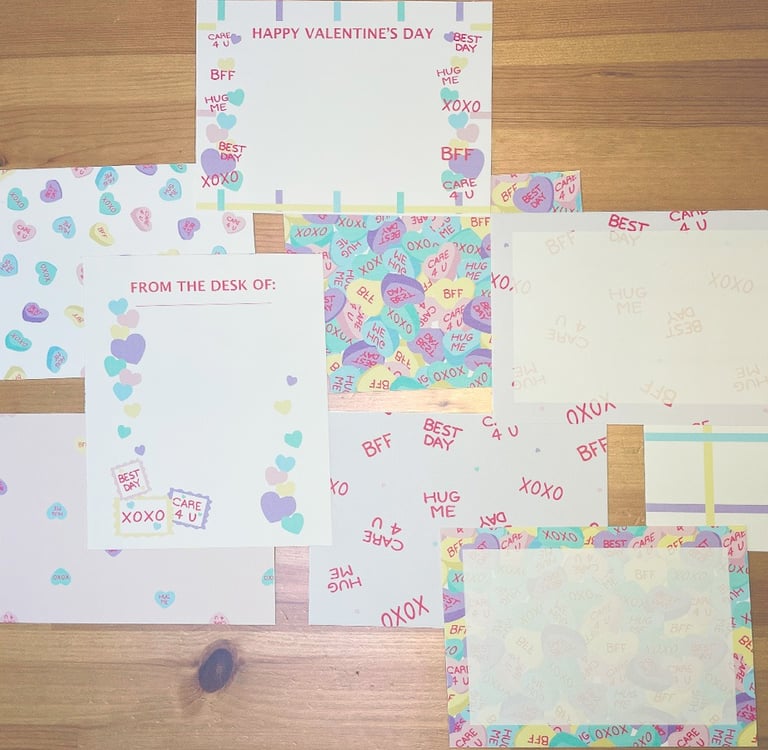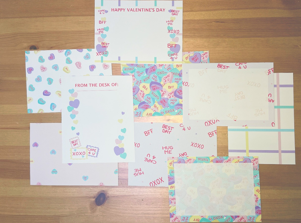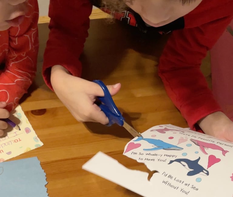 This day we were focusing on all of our Valentine’s Day cards that we wanted to send to family, and special friends. If we send anything in the mail, I try to get it out a few weeks ahead of when I want it to get there just to be on the safe side. We have created our new Penpal Kits for Valentine’s Day. There is a “Candy Hearts” collection, and there is a “I Whale Always Love You” collection. Using the digital downloads, I printed the papers out and placed them on the table for the kids to pick and choose which ones they wanted to use to write letters.